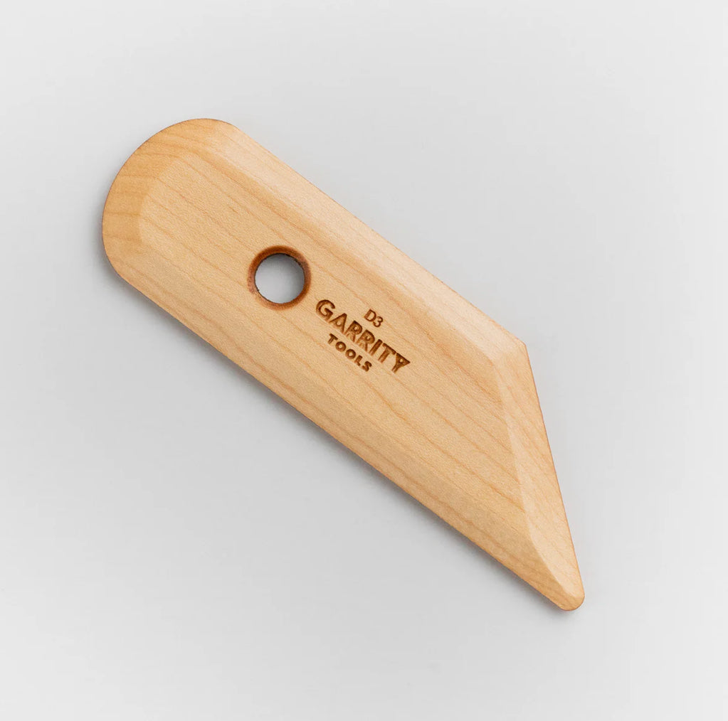 Our D3 pottery tool combines long flat edges, a soft curved end, and a 40° angle with a blunt tip. All of these were designed for hand-building and sculpting, but each element also proves to be indispensable when throwing on the wheel.