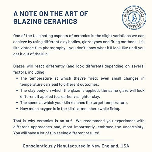 Details: Penguin Pottery’s glazes offer a huge range of effects to choose from: vivid, bright, smooth, glossy, textured, satin, matte; opaque, semi-opaque, semi-translucent, translucent, flowing, non-flowing. Our low fire glazes are perfect for school projects, classrooms, studios, and potters who do not fire at high temperature. These low fire glazes are the potter’s choice when looking for a wide palette of colors, like celadon, lively reds, deep greens, bright blues. Our mid fire glazes offer similar ranges but also introduce interesting effects and tonality not available in low fire glazes. Our glazes are lead-free, non-toxic and food safe (when properly fired and tested). Make sure to shake the jar well before using, and do not allow it to freeze. Try them out and let us know what you think!