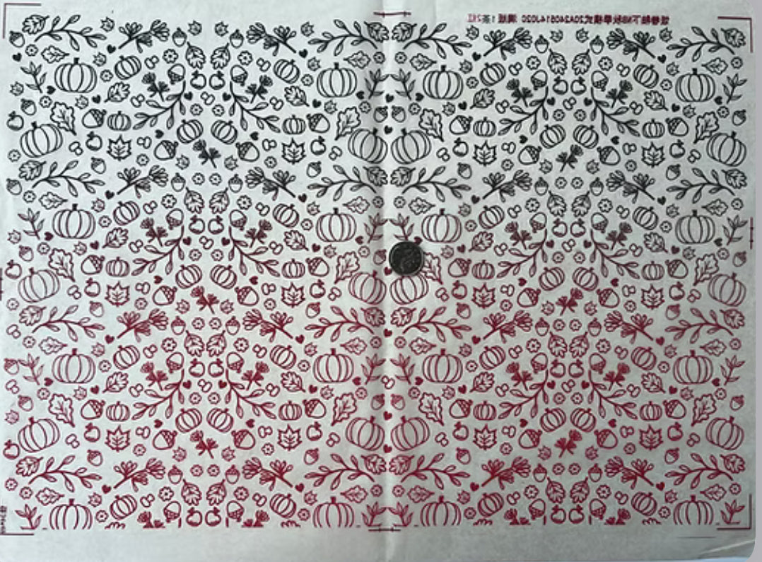 Fall Vibes features a fall motif with leaves, acorns, pumkins and much more. This design is a full coverage pattern and first in the market to be offered in ombre
