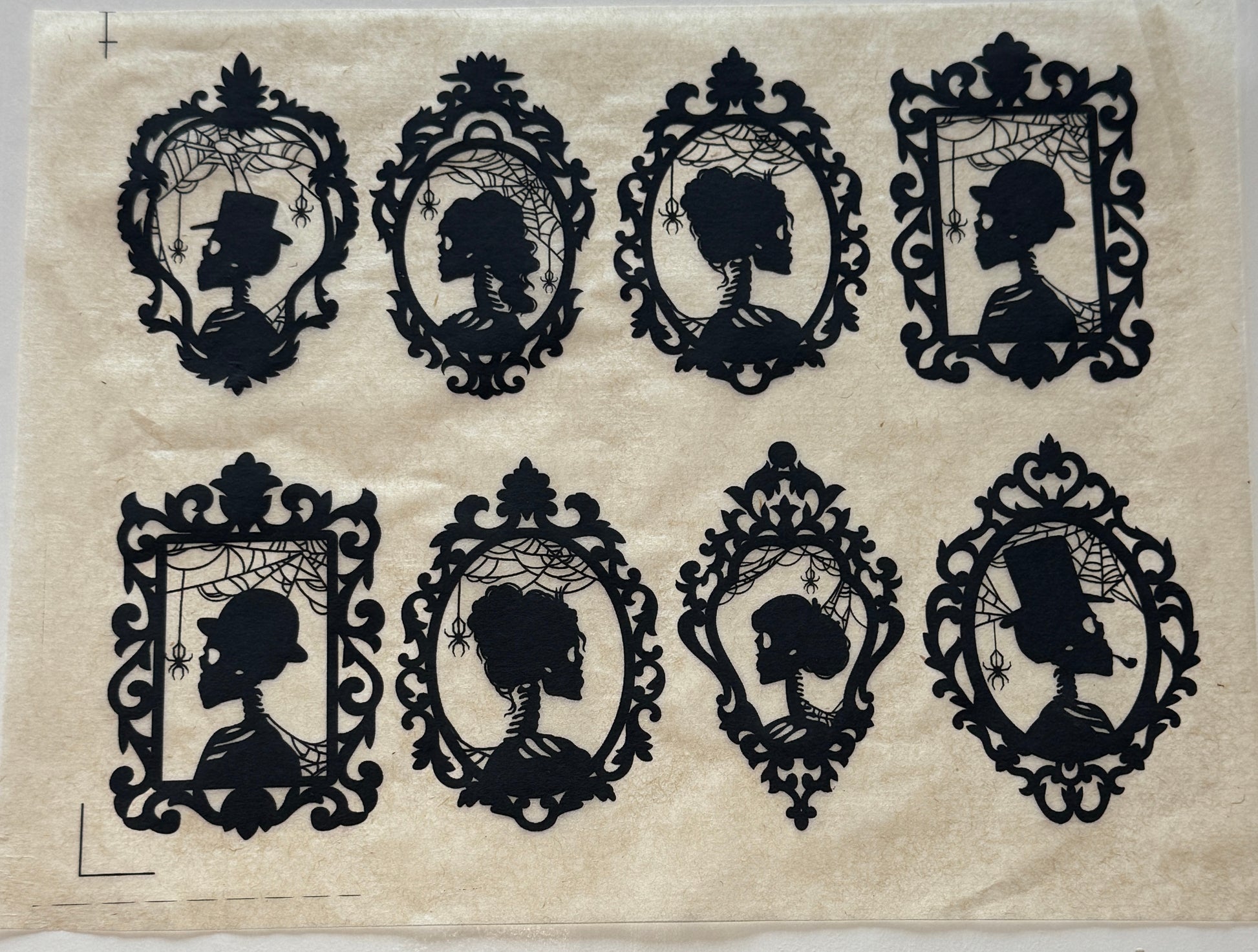Family Portraits is a Halloween themed design featuring skeletons silhouettes framed.