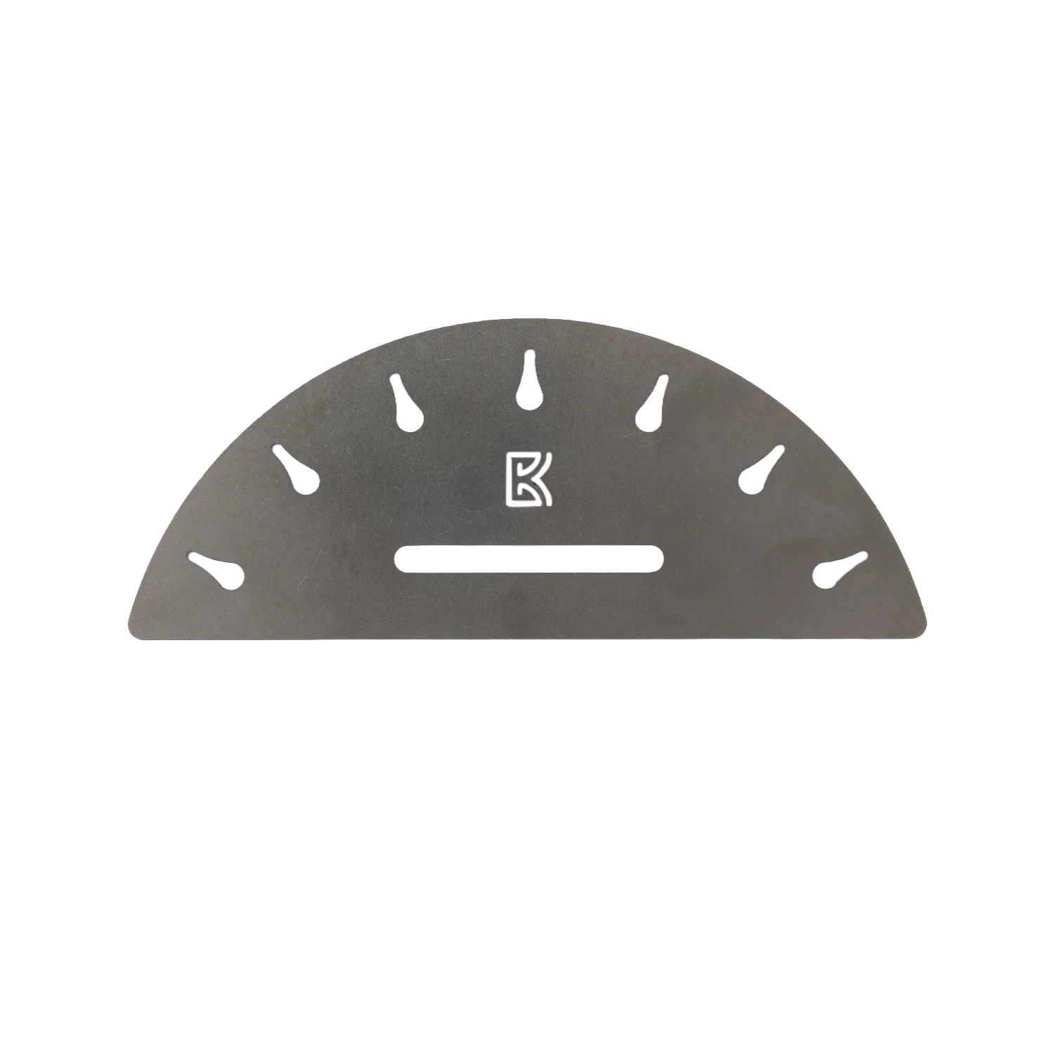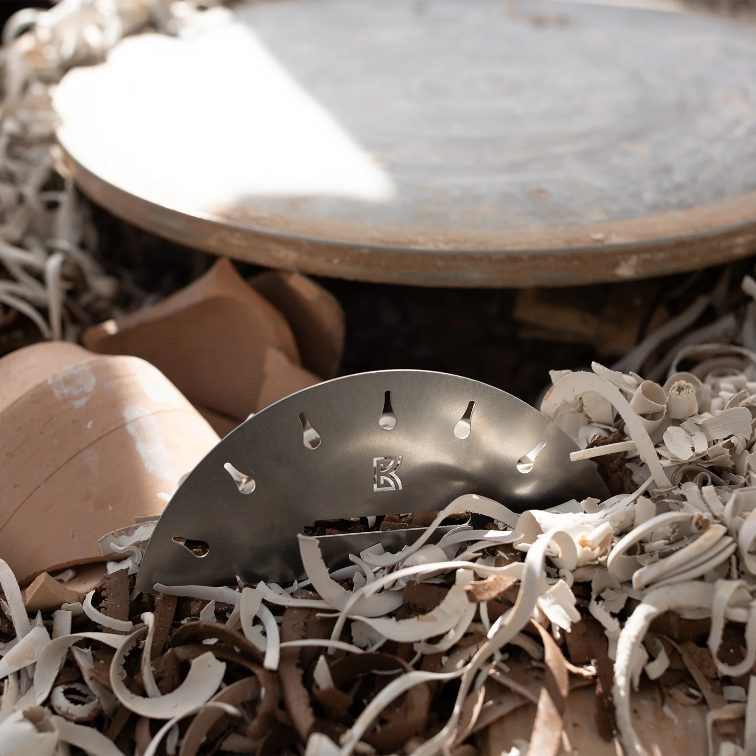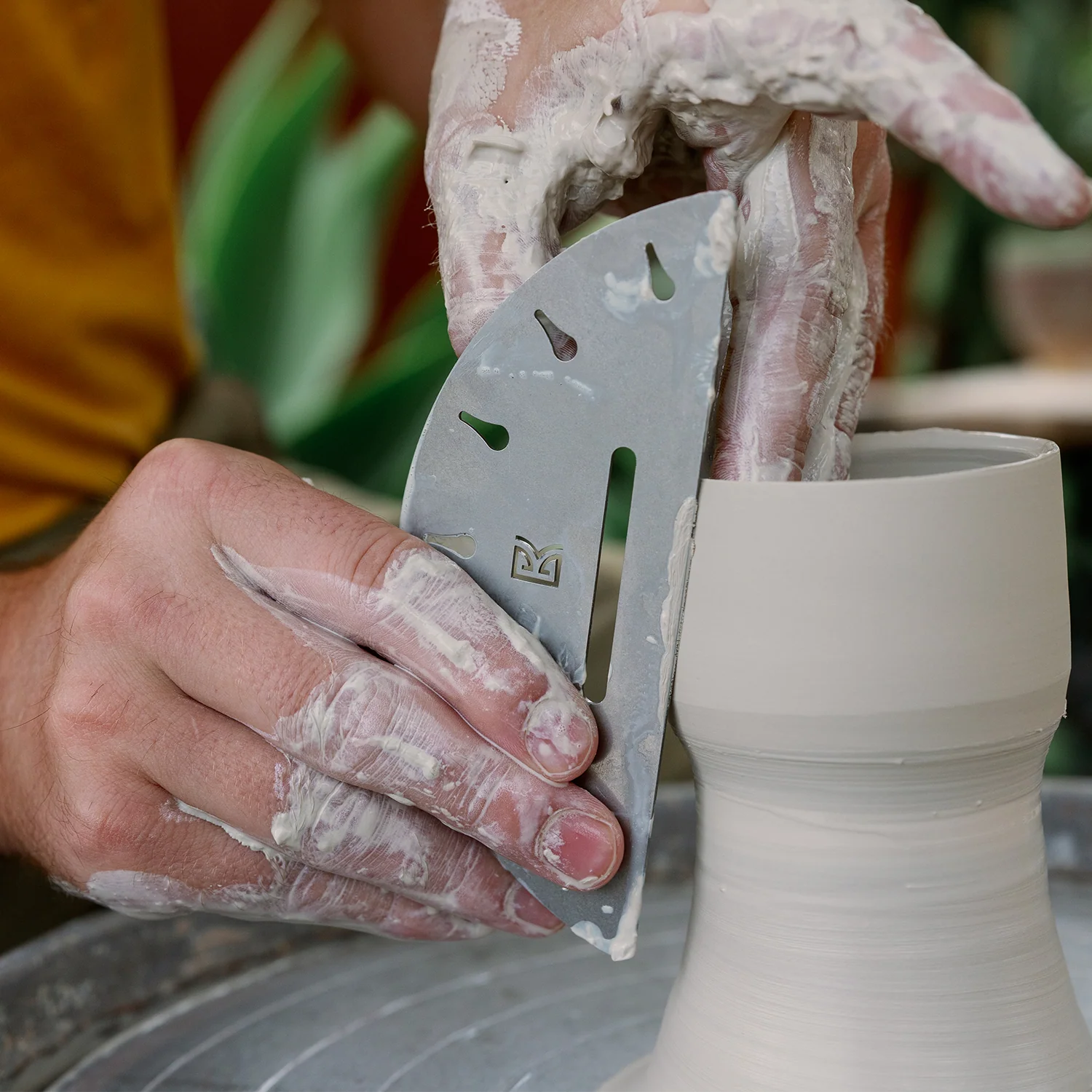 A large arc for shaping larger bowls or wide dishes. The slots along the edge can be used as guides for measuring or designing.