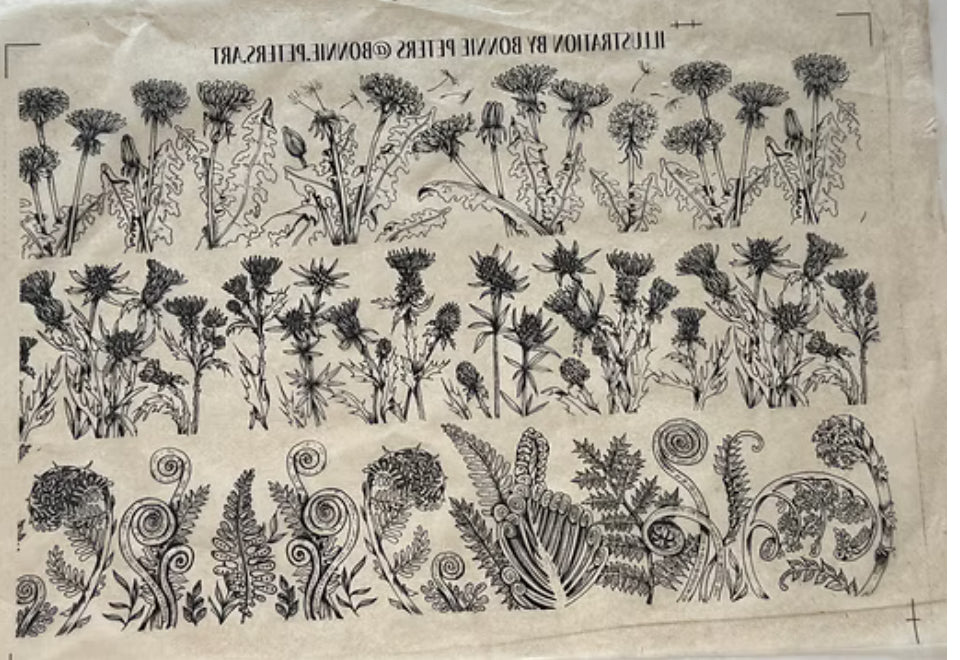 This stunning design was hand drawn by Bonnie Peters in pen and ink. Featuring 3 rows; dandelions, thistles and fiddleheads.