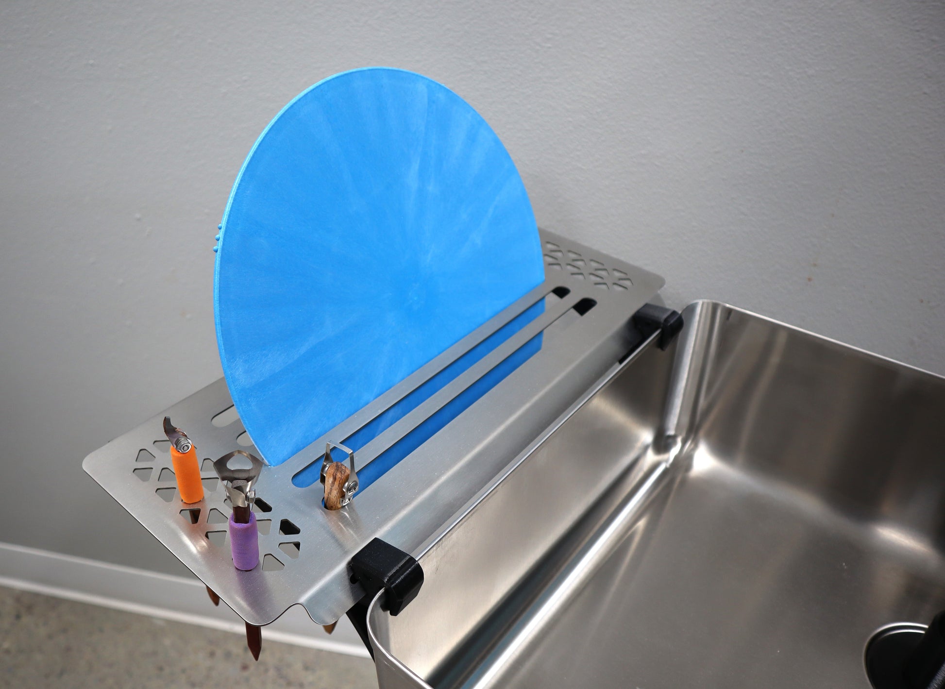 - Basin holds water for washing clay from tools; faucet allows for rinsing