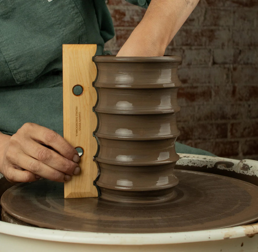 The Profile 4 pottery tool is a whopping 7.75” tall to help you bring a consistent texture all the way up your tall mug, vase, bowl, and more. With Profile 4, you can add a concave bubble spaced evenly to any clay vessel again and again, getting it exactly the same every time. Use the flat side of this tool to straighten and prep your cylinder for shaping. Then, flip the tool to the textured side and seamlessly add ridge after ridge to your piece.
