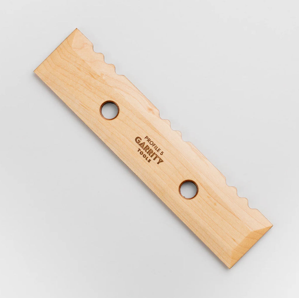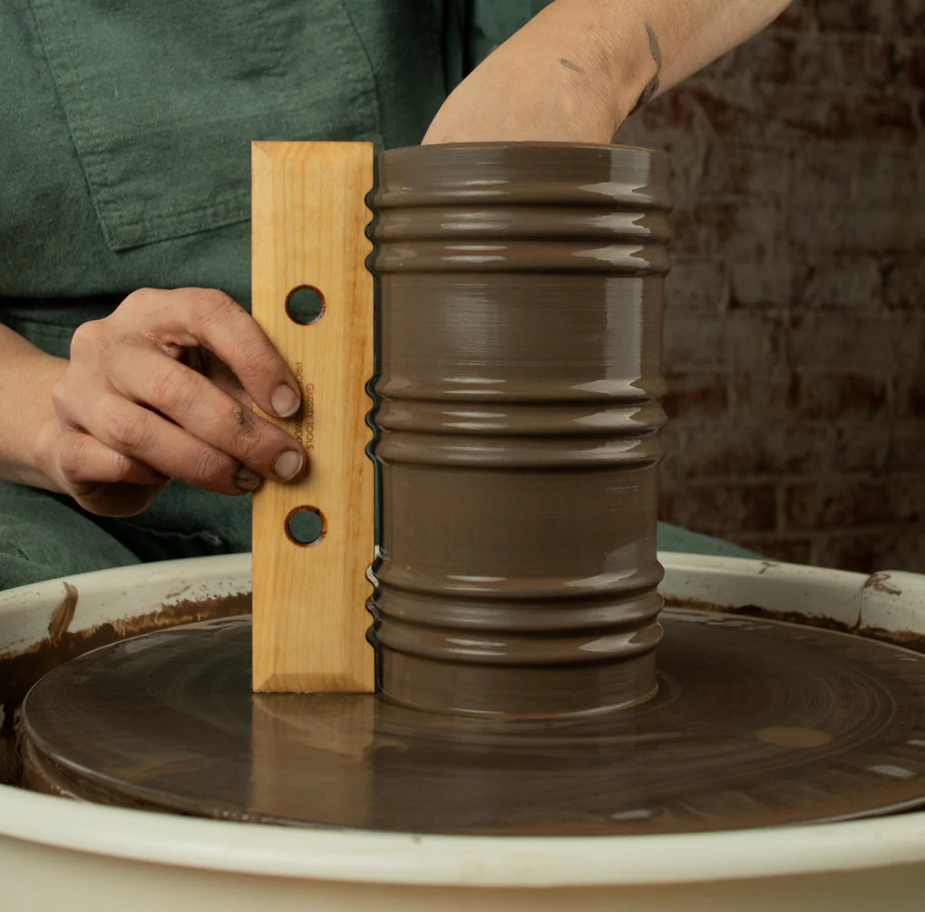 The Profile 5 pottery tool is a whopping 7.75” tall to help you bring a consistent texture all the way up your tall mug, vase, bowl, and more. With Profile 5, you can add a repeating pattern of three concentrated lines followed by a larger break in the pattern before adding the next set of three lines. Use the flat side of this tool to straighten and prep your cylinder for shaping. Then, flip the tool to the textured side and seamlessly add ridge after ridge to your piece.