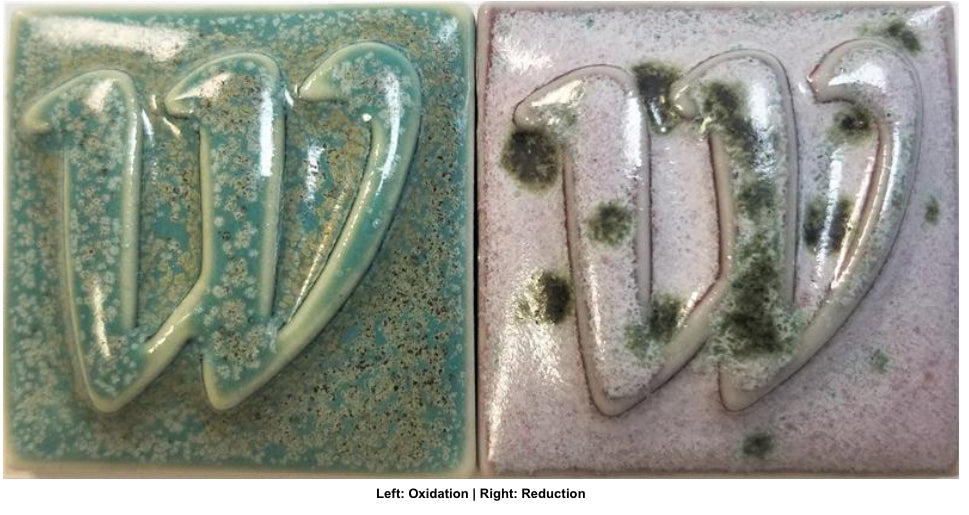 Apply 3 coats to clean high fire bisque. Fires either electric in oxidation (left image), or gas in reduction (right image).