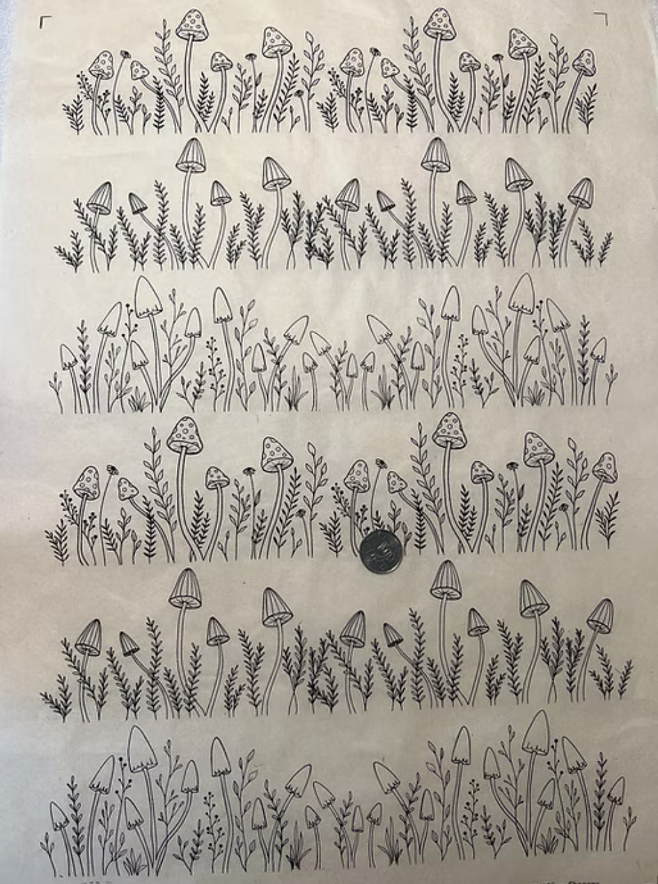 This design is comprised of 6 whimsy mushroom borders 2 of each design. Printed on a 13x19 inch rice paper tissue. This transfer can be fired to a range of 04-10.