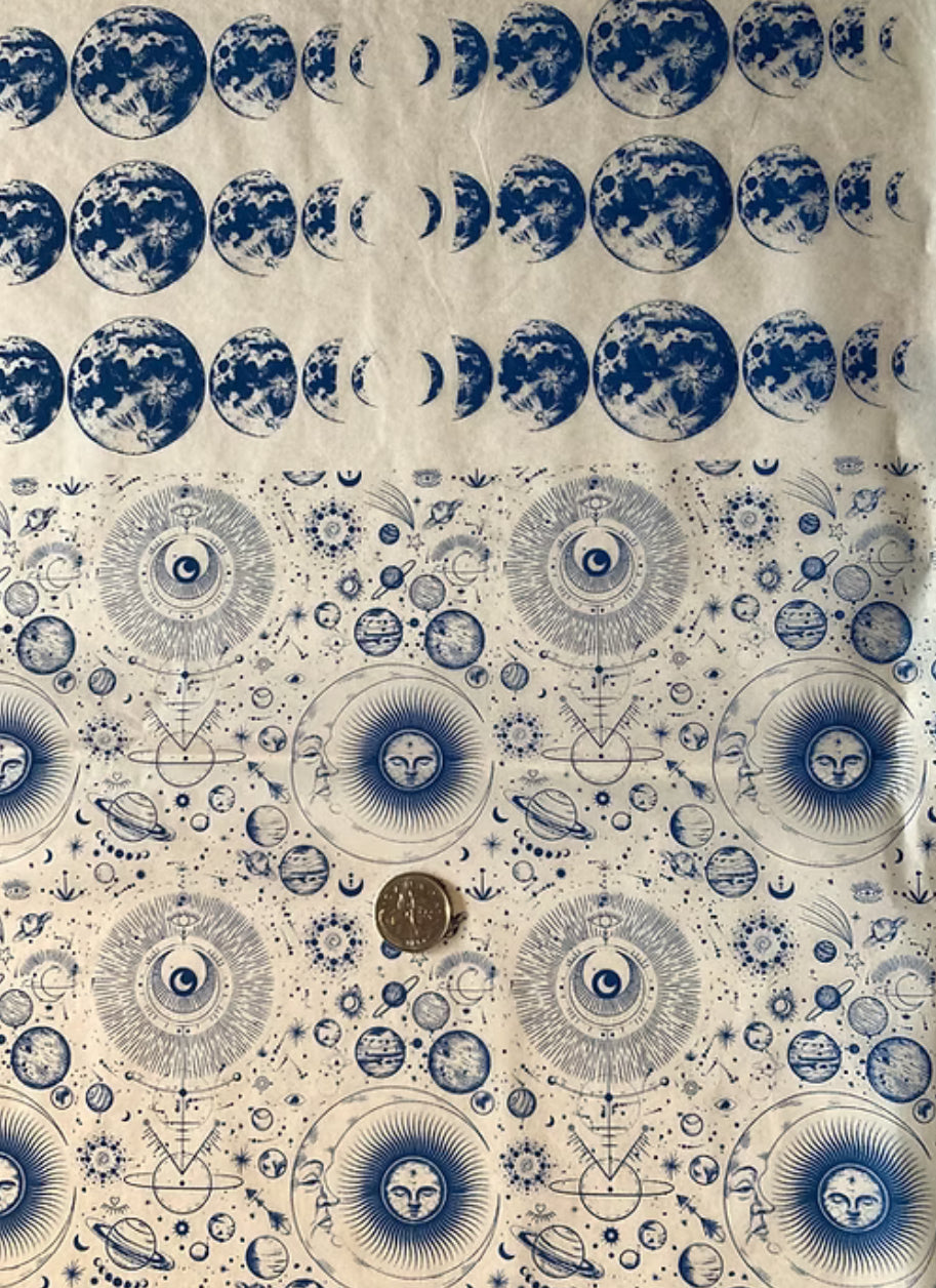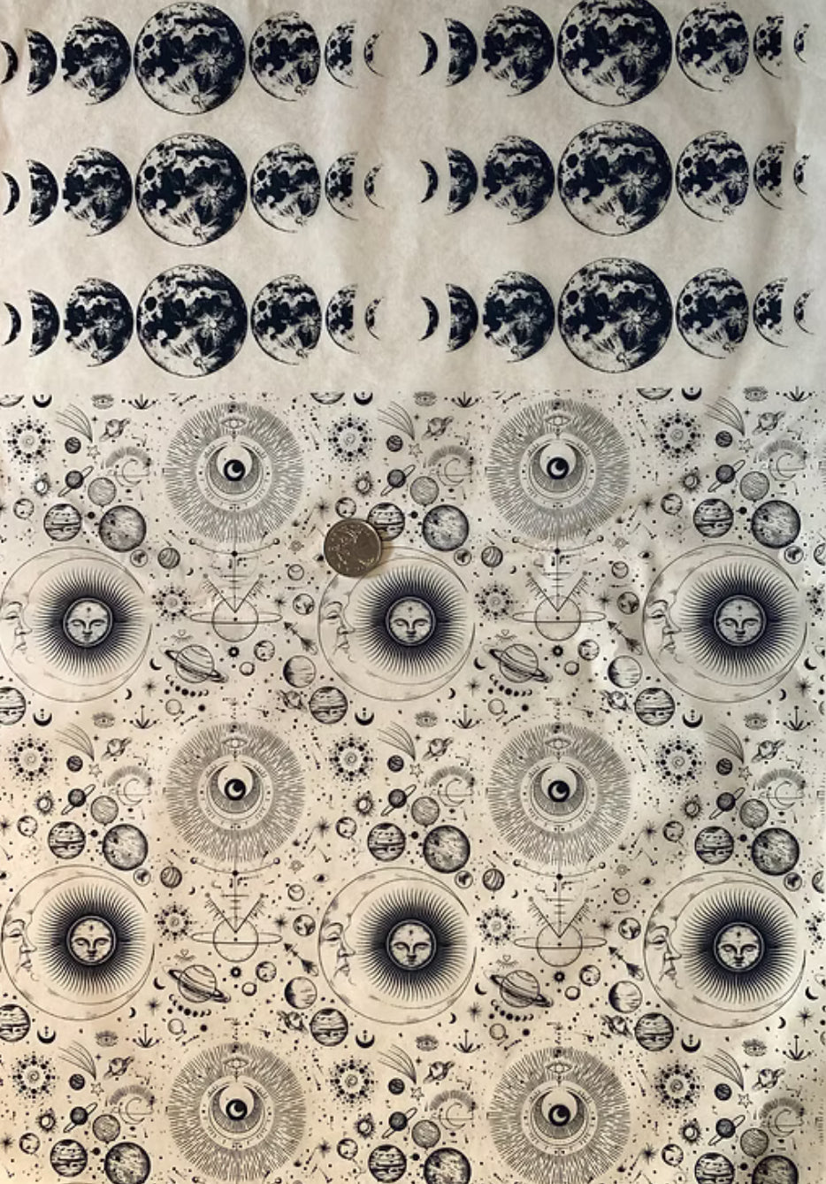 The Universe is a food safe ceramic underglaze transfer made of thin rice paper with a decal area of 13x19 inches. This paticular pattern includes a variety of space/universe inspired items. This transfer can be fired to a range of 04-10.