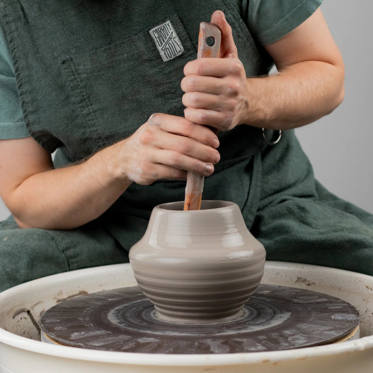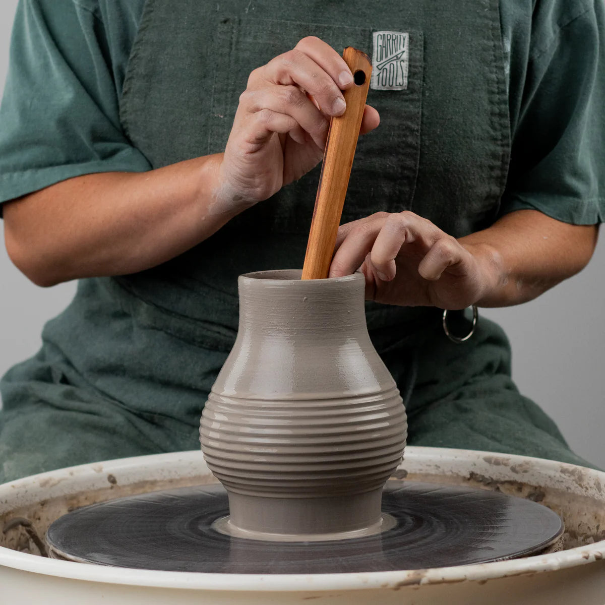 Our Throwing Stick is designed for easy gripping while you use it to expand and shape narrow-mouthed vessels. Drop it into a tall thin cylinder and gently press the head of the Throwing Stick against the lower walls to create round forms. With this tool, you can change the form of your vessel from the inside while retaining exterior textures and details. The shape of the head was tested and perfected for stretching clay in many directions and will assist you in pulling your walls straight up or pushing them out wide.